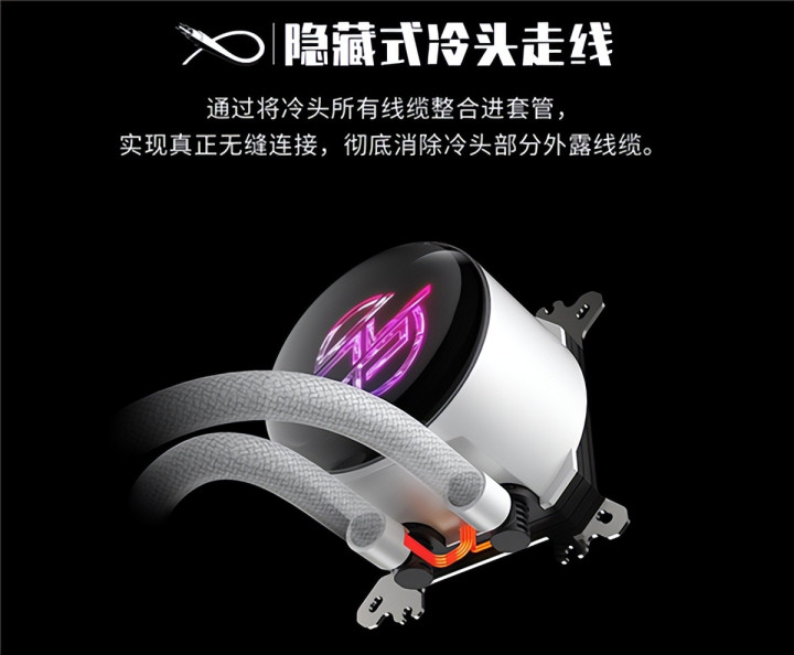 该水冷还采用隐藏式冷头走线与磁吸式简易盖板设计,实现无缝视觉效果,搭配预装风扇的隐藏线缆设计,进一步凸显风扇的ARGB灯效。