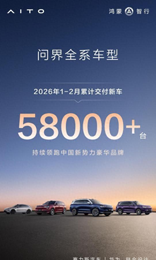 DoNews汽车3月2日消息,3月1日,问界汽车发布最新交付数据,2026年1-2月累计交付新车超5.8万辆,实现强势开局,持续领跑中国新势力豪华品牌。