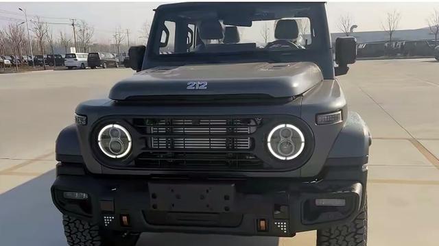 首先要说的是,虽然尚不清楚现阶段曝光的实车,是否就是其最终的量产版本。但从实拍图来看,其整体外观并不像申报图那样采用最新的设计理念;而是基本延续了212 T01的前脸造型。不过,其车头前机盖的蚌式结构,搭配内置有圆形头灯与大尺寸镂空样式组成的进气格栅以及粗壮的前保杠,倒也能一如既往的流露出硬派、粗犷面容。