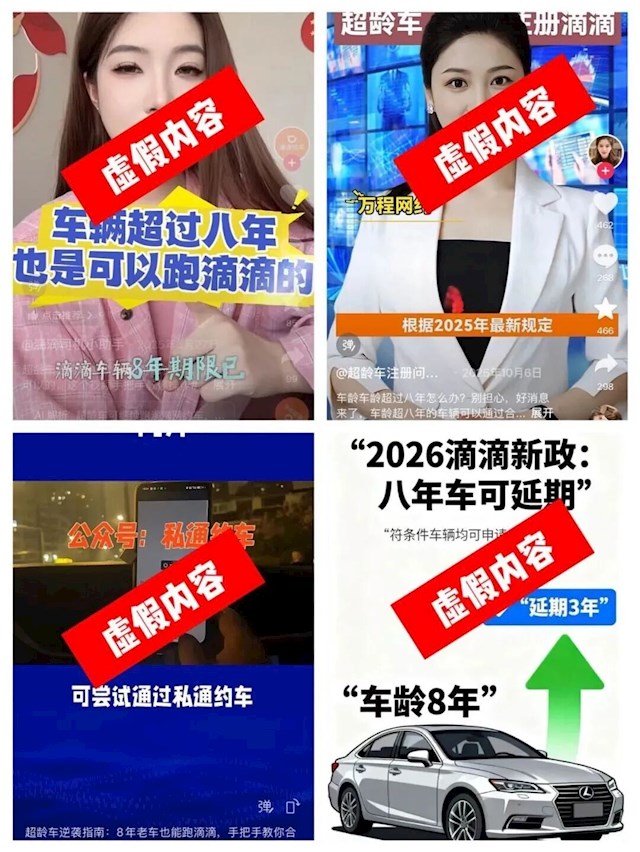 据介绍,目前网络上标注“延期超龄车”“超龄车跑滴滴教程”的视频,多借助AI批量出现,信息纯属捏造。