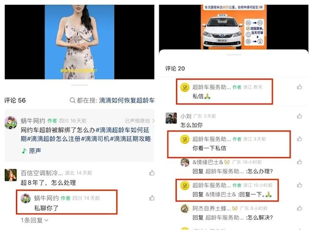 相关内容存在多种版本,有的编造部分城市“放宽超龄车标准”谣言,有的冒用滴滴名义、暗示其滴滴工作人员身份,称“合规政策更新”,表示可以进行“后台操作”,并营造“大批师傅已重新上线接单”假象。