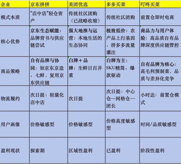其他像叮咚买菜、盒马这样的跨界玩家,虽不属于传统社区团购,但其前置仓或店仓一体模式更侧重品质、即时性,吸引了对价格不敏感但追求便利和品质的用户,形成了差异化优势。