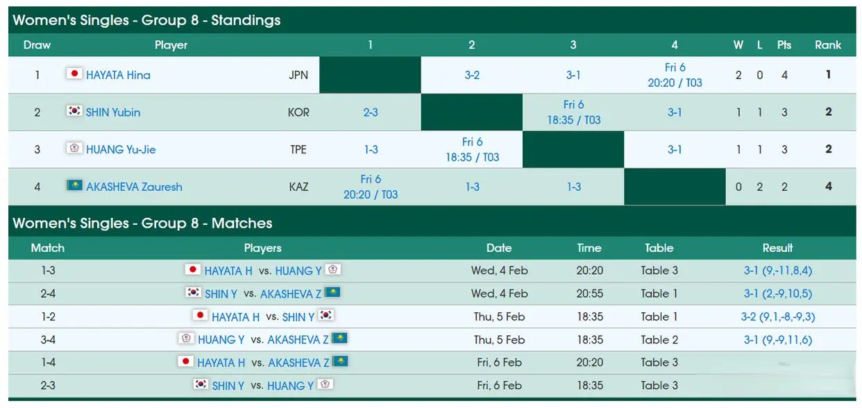 这场比赛后日乒核心早田希娜完成二连胜已经提前锁定了16强席位,但申裕斌、黄愉倢两人都是一胜一负,这两人同为小组第二,这样一来申裕斌、黄愉倢两人在2月6日的第三战就成为生死战,申裕斌、黄愉倢这两人谁赢谁就晋级16强。