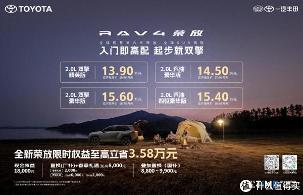 价格直降1.8万元、厂补至高8000元,再享受国补至高约万元,综合折算,购买全新荣放,真金白银至高立省3.58万元。因此,智能电混双擎精英版实际价格即全新荣放起步价仅为13.9万元。没有套路,没有期货;入门即高配、起步就双擎、上车有TSS 4.0智行安全,且油混同强;购买全新荣放,品质口碑更可靠、长期价值更划算,买车一步到位更省心。