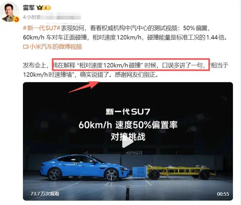 但这并不等于120的速度撞墙,计算能量的时候不能这么算,很显然就是雷总在描述时的口误,对此雷军在其社交平台上已经致歉,并承认了错误。
