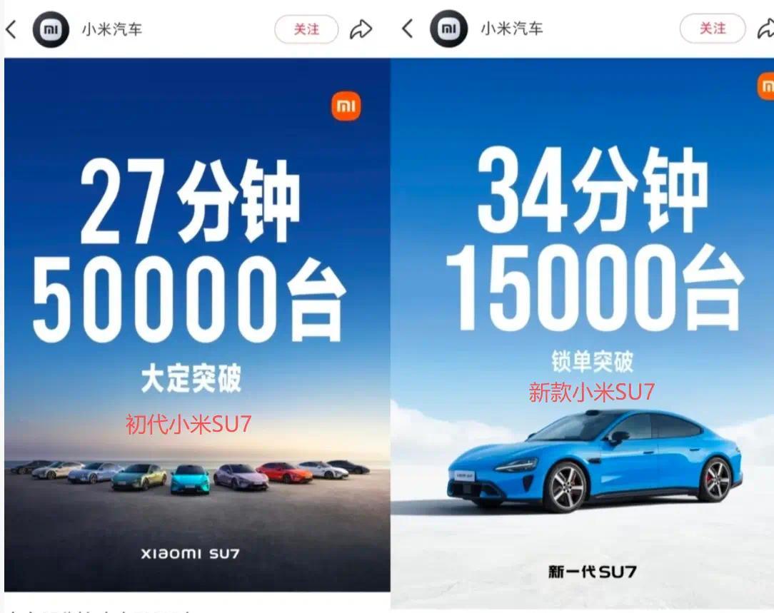 但该车上市后的订单情况却不如老款,老款SU7上市27分钟,大定订单突破5万台,而全新升级的SU7,34分钟数据仅为15000台,差距为什这么大呢?