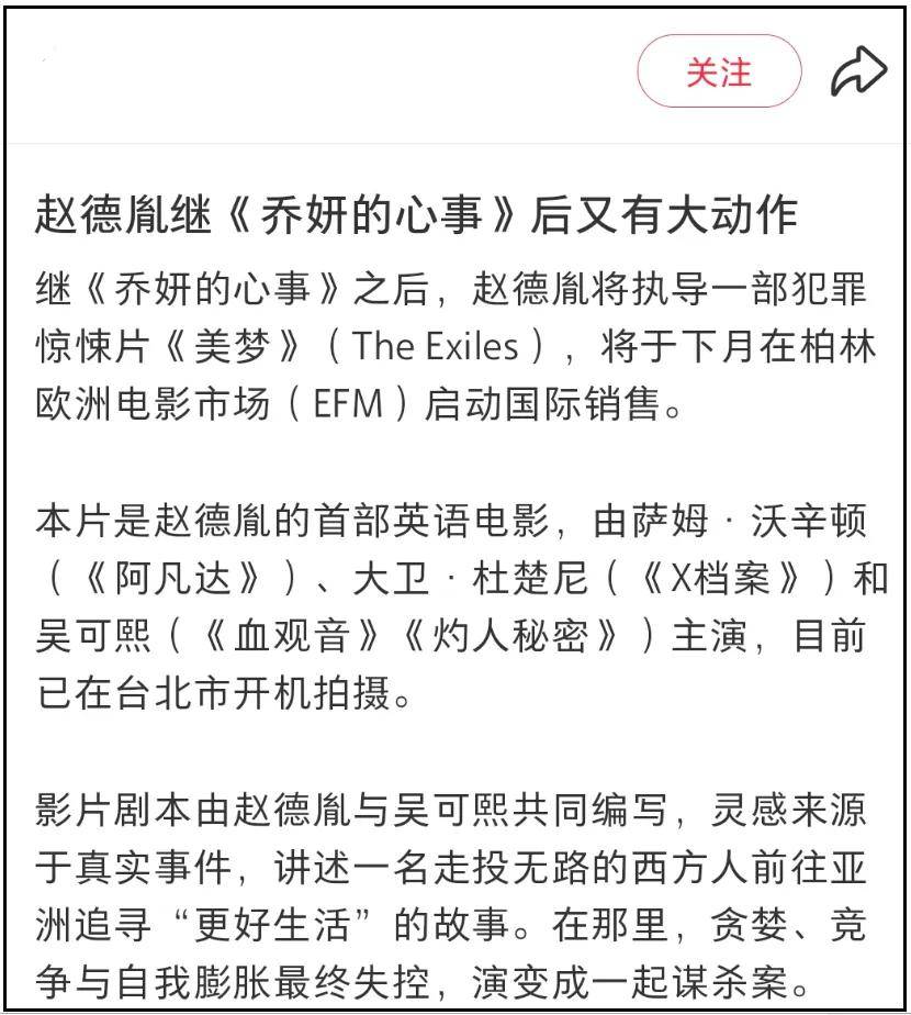《美梦》是赵德胤导演、编剧、监制的首部英语长片,吴可熙不光是女主,还是共同编剧和执行监制,片子筹备了七年,种种信息综合下来,让人忍不住怀疑赵德胤和前女友到底是复合,还是根本没分手?