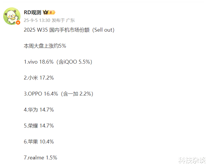 这不在2025年W35周vivo又成为国内排名第一的品牌,市场份额达到18.6%,不过这一周的份额相对减少了一些,其中vivo占比13.1%,iQOO占比5.5%。小米继续排名第二,市场份额达到17.2%,应该是REDMI Note 15系列开售导致的。OPPO排名第三,市场份额为16.4%,其中OPPO占比14.2%,一加占比2.2%。华为这一周上升到第四位,市场份额为14.7%,荣耀这一周排名第五位,市场份额也是14.7%。行业人士之所以把华为到第四,应该是整体销量稍多于荣耀的结果。苹果还是排名第六的品牌,市场份额为10.4%,realme排名第七位,市场份额为1.5%。